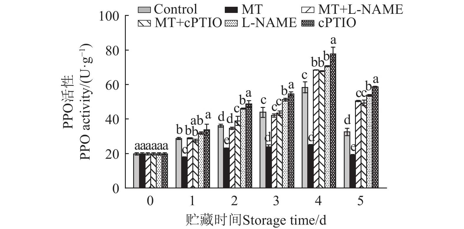 • 摘要: 为研究NO参与褪黑素(melatonin,MT)延缓莲子采后褐变的作用机理,该研究采用蒸馏水、NO、MT、一氧化氮合酶抑制剂(nomega-nitro-l-arginine methyl ester,L-NAME)、硝酸还原酶抑制剂(tungstate,TUN)和NO清除剂(Carboxy-PTIO,cPTIO)、MT + L-NAME、MT + TUN和MT + cPTIO对莲子进行处理。MT处理的莲子内源NO含量显著高于对照组(P < 0.05),且一氧化氮合酶(nitric oxide synthase,NOS)活性在贮藏前3 d提高60.36%~71.08%,NO合成途径中关键物质L-精氨酸和瓜氨酸含量显著高于对照组(P < 0.05),尤其在第1天时瓜氨酸含量为对照组的1.44~1.59倍,但对硝酸还原酶(nitrate reductase,NR)活性的影响并无规律;当MT结合NOS抑制剂L-NAME对莲子处理时,莲子内源NO含量显著低于对照组(P < 0.05),且MT保鲜效果消失;当结合NR抑制剂TUN时,莲子内源NO含量显著高于对照组(P < 0.05),且MT仍具有保鲜效果,因此初步确定MT通过NOS途径诱导莲子内源NO生成。在此基础上,通过分析鉴定得出莲子中主要酚类物质为儿茶素(占总酚含量60%以上),后续重点分析了MT通过NO调控莲子儿茶素代谢的机理。结果得出,MT处理的莲子多酚氧化酶(polyphenol oxidase, PPO)活性低于对照组35.39%~57.36%,同时该处理显著提高了其儿茶素合成代谢关键酶肉桂酸-4-羟化酶(cinnamate-4-hydroxylase,C4H)、二氢黄酮醇还原酶(dihydroflavonol 4-reductase,DFR)、查尔酮合成酶(chalcone synthase,CHS)、查尔酮异构酶(chalcone isomerase,CHI)和植物无色花青素还原酶(colorless anthocyanin reductase,LAR)活性(P < 0.05),由此其儿茶素含量在1 d后高于对照组15.35%~47.86%,但当MT结合L-NAME或cPTIO处理时,该效果消失。因此,外源MT通过NOS途径诱导NO合成造成NO的大量积累,并作用于莲子儿茶素,一方面抑制其与PPO产生酶促褐变,另一方面促进其合成,最终延缓莲子采后褐变进程。