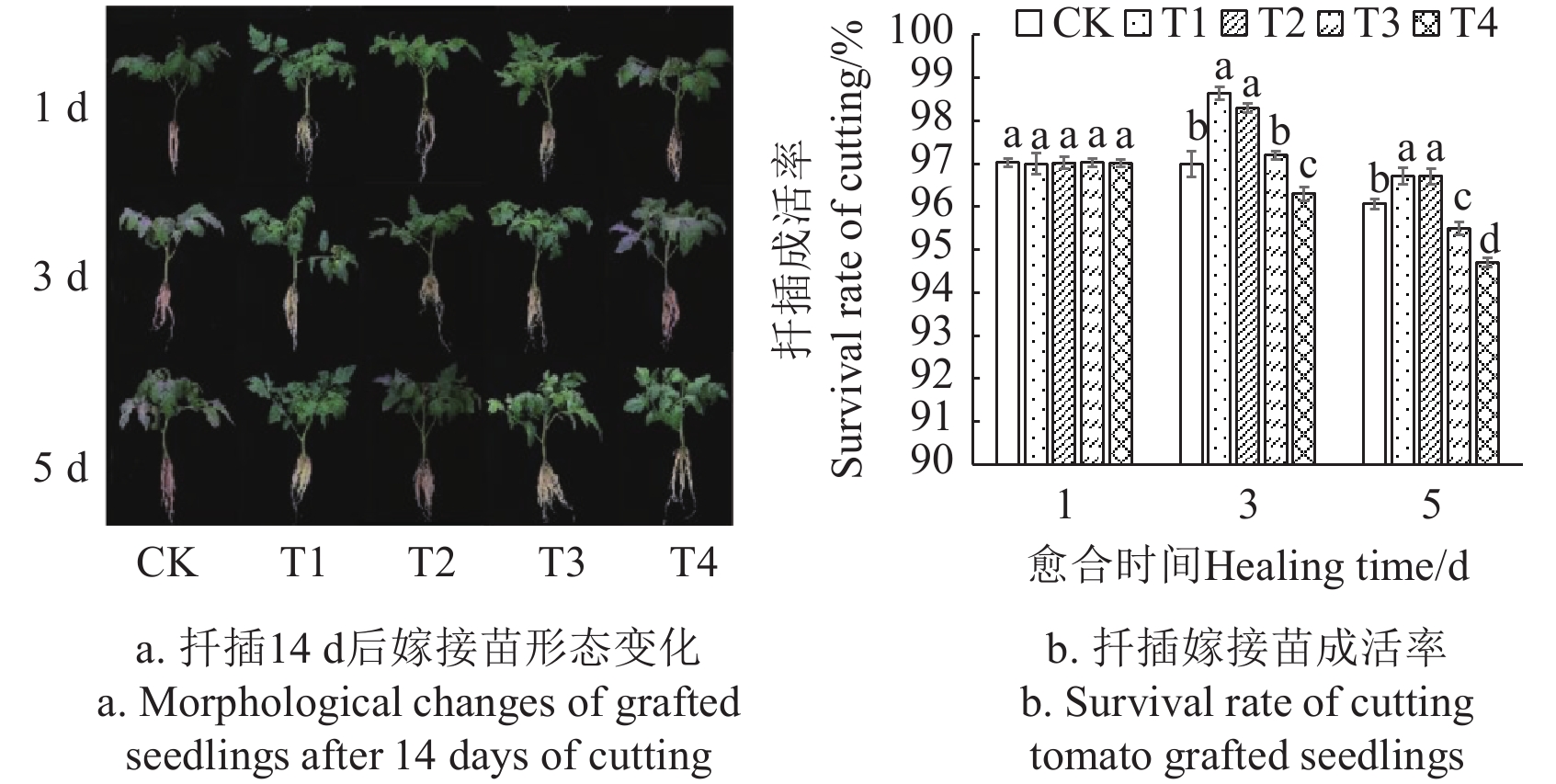 2·s) at 1-2, 3-4, and 5 d, respectively. The best performance was obtained to cut within 3 d during the high-density healing stage of two-stage grafted tomato, in terms of the survival rate and the quality of grafted seedlings. The finding can also provide technical support to the two-stage grafted seedling of tomatoes.